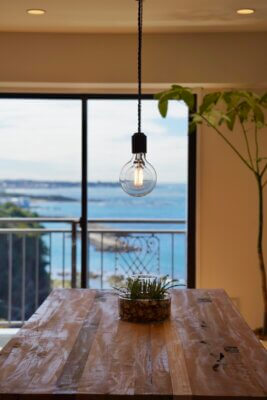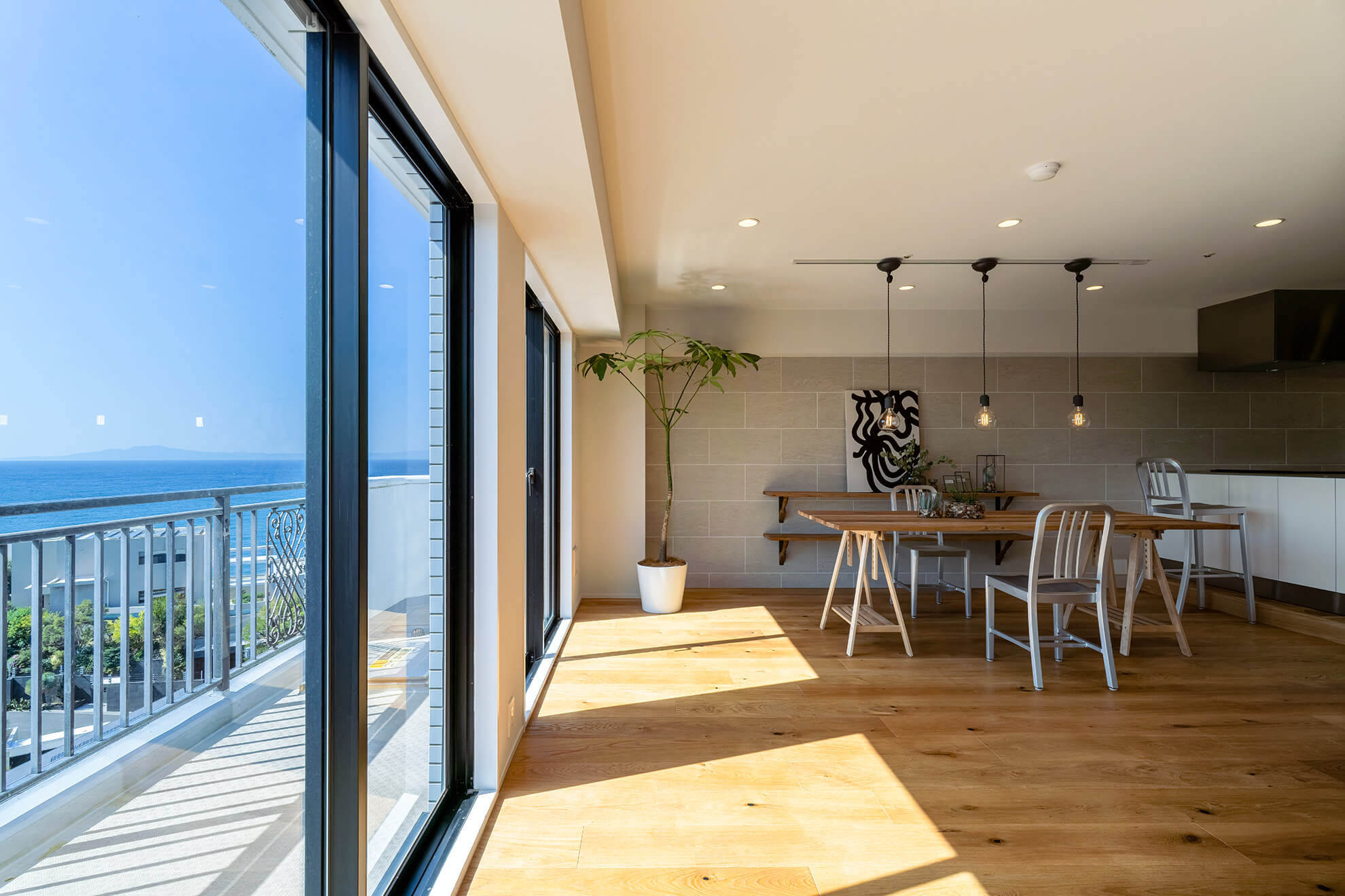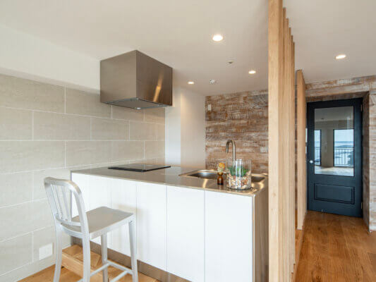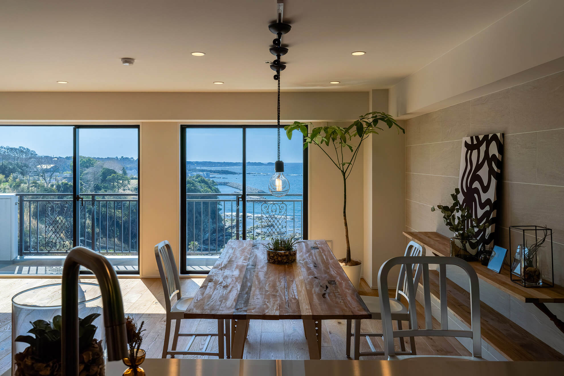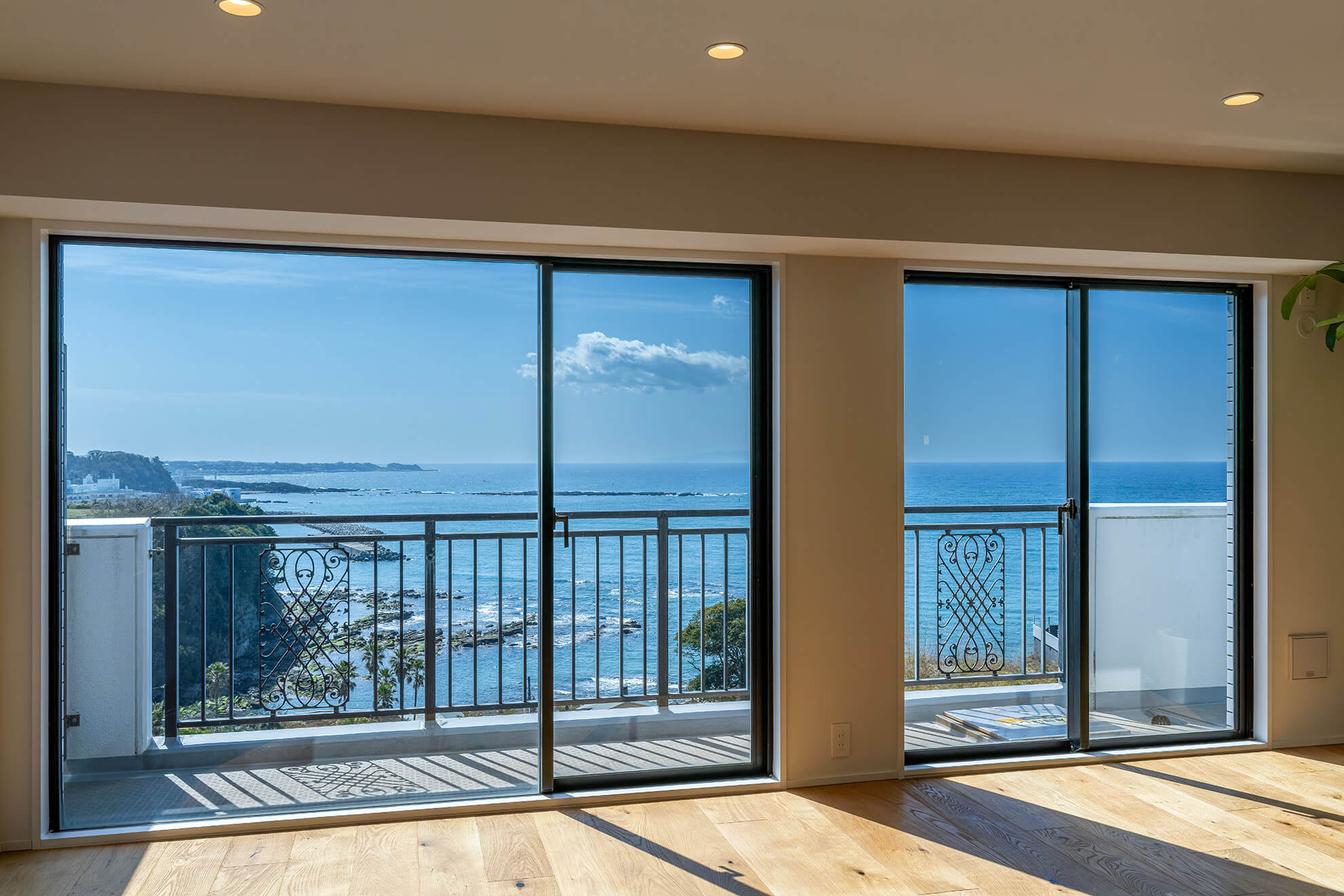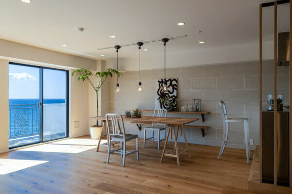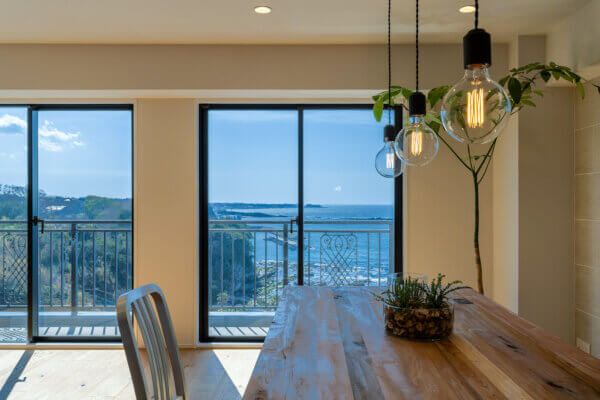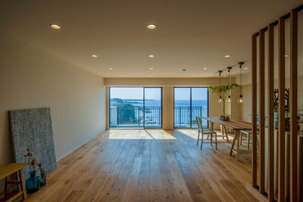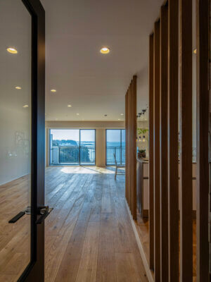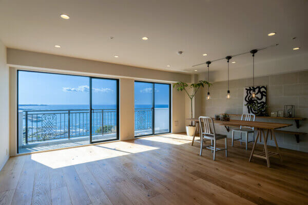 南葉山・秋谷の海沿いに建つ建物 最上階14階のお部屋からは、相模湾を一望する圧倒的な眺めが広がります。窓を開ければ、聞こえてくるのは対岸の磯に打ち寄せる波の音。高層階ならではの開放感と落ち着いた雰囲気が日常の喧騒を忘れさせてくれます。滞在する時間そのものが贅沢に感じられる、大人のための一室です。